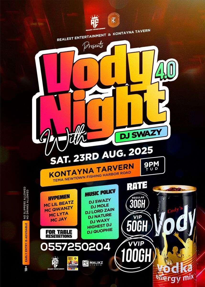 Get ready for the ultimate nightlife experience as Vody Night 4.0 returns bigger and louder! Join us on Saturday, 23rd August 2025 at Kontayna Tarvern, Tema Newtown Fishing Harbor Road for a night of electrifying music, unbeatable vibes, and non-stop entertainment.