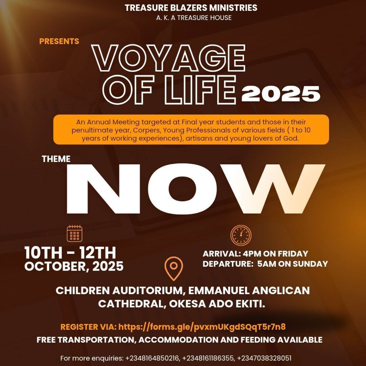 Embark on a transformative journey at Voyage of Life 2205! This inspiring event promises a life-changing encounter filled with hope, faith, and spiritual renewal. Experience powerful moments of worship, uplifting messages, and a vibrant community eager to rise together. Join us and be part of a divine adventure that will leave a lasting impact on your soul. Donβt miss this extraordinary spiritual voyage! πβ¨
