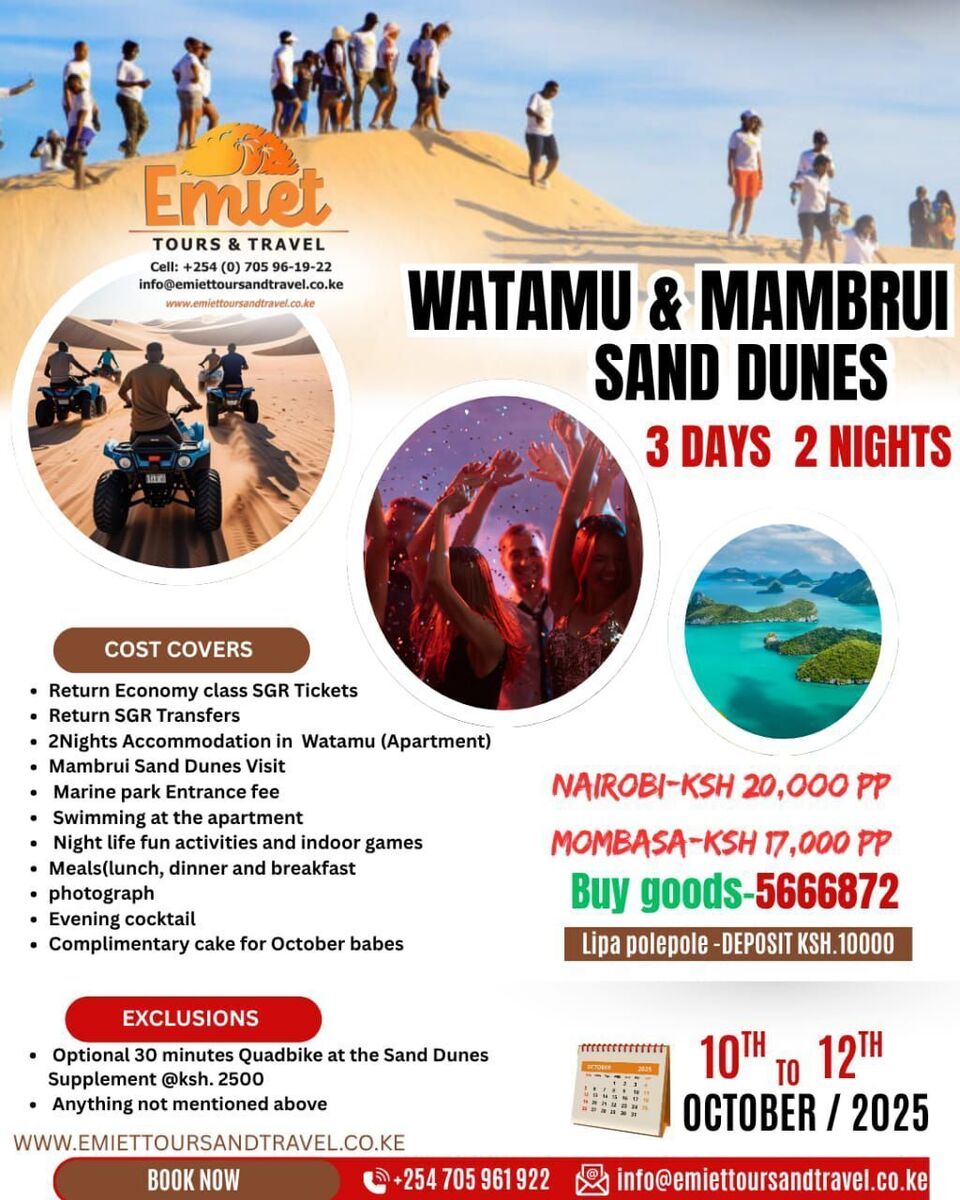 ๐๐๏ธ Experience an unforgettable adventure at the Watamu & Mambrui Sand Dunes! Join us for a thrilling 3-day, 2-night excursion along Kenya's stunning coast. Explore vast sand dunes, enjoy coastal vibes, and connect with fellow travelers in a lively, scenic setting. Whether you're seeking adventure, relaxation, or new connections, this event offers it all with a touch of beachside charm. Pack your bags for an epic journey full of fun, exploration, and memorable moments! โจ๐ด