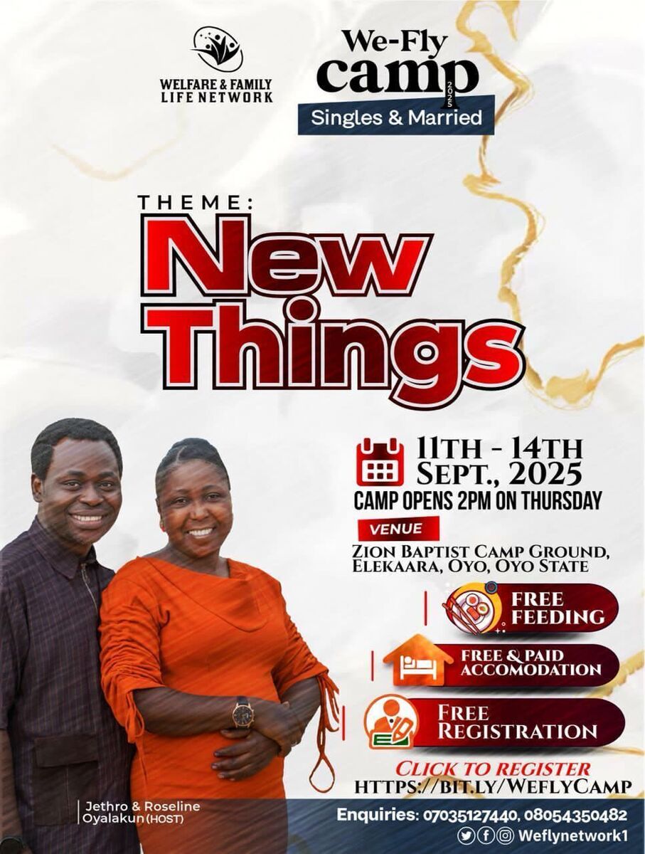 π Join us for the 10th Edition of We-fly Camp 2025! Experience an inspiring gathering at Jamoje, Oyo, Nigeria, designed to foster spiritual growth, community bonding, and personal empowerment. This camp offers a unique environment where attendees can connect deeply through prayer sessions, motivational teachings, breakout workshops, and fellowship. Expect an electrifying atmosphere filled with raw sermons, life-changing encounters, and delicious meals. Whether you're seeking spiritual renewal or new friendships, We-fly Camp 2025 promises an unforgettable experience.