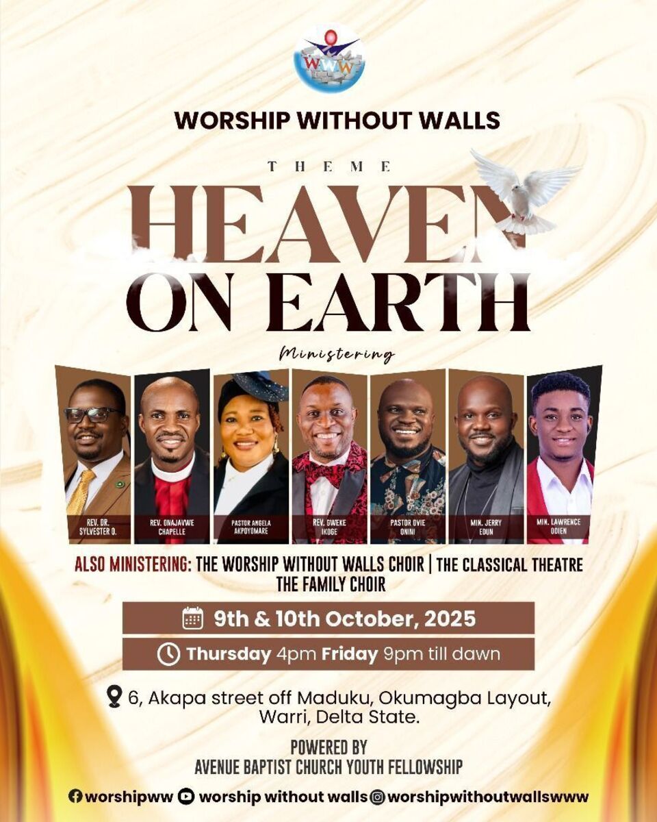 Experience a powerful and unifying worship gathering at Worship Without Walls 2025! This annual event, initiated by Avenue Baptist Church Youth Fellowship, now transcends denominations to bring together worshippers, especially youths, from all over the country. Join us in a soulful journey of Word and Worship, as we come together to celebrate the Majesty and Glory of our Maker. Whether you're seeking a day of spiritual renewal or a vibrant community gathering, this event promises inspiring sessions, heartfelt worship, and divine encounters.